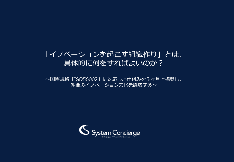 システムコンシェルジュは、ビジネス活動にイノベーション・マネジメント・システムを取り入れ、お客様にサービスを提供するジェネレーティブ・プロバイダーです。私たちは「IdeaScale」を含む様々なITツールを活用し、「ISO 56002」規格の認証をわずか三ヶ月で取得しました。この経験を基に、お客様のイノベーション推進と組織構築を総合的にサポートします。