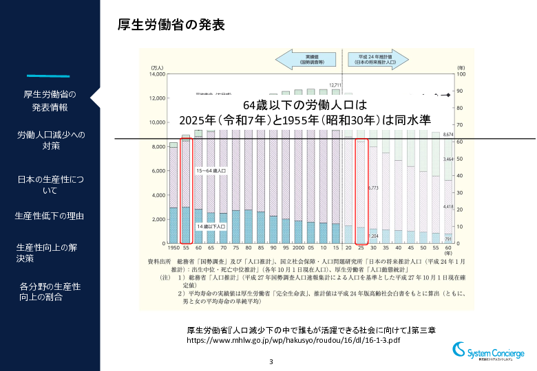 少子高齢化に伴い、日本の労働力人口の減少は深刻な問題となっています。特に64歳以下の労働力人口の減少が懸念されており、豊富な知見や経験を持つ人材の退職により、企業内の貴重なナレッジが失われつつあり、製品やサービスの品質や価値の低下リスクが高まっています。
