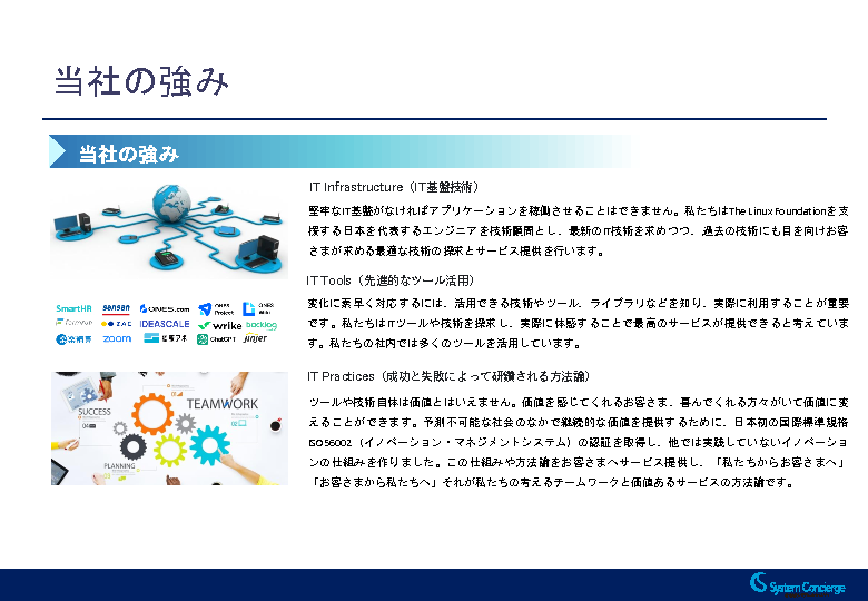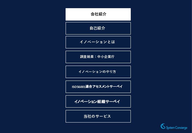 システムコンシェルジュは、イノベーション・マネジメントの国際規格である「ISO56001」の認証を、日本で初めて取得した企業です。その経験とノウハウをもとに、本セミナーでご紹介するサーベイにとどまらず、イノベーションの実践と定着に向けた包括的な支援を提供しています。