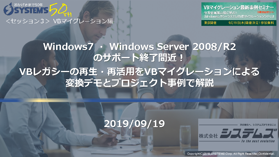 14:40~15:10 Windows 7/Windows Serever2008/R2のサポート終了まで残り半年、選択が迫られるVBレガシーの今後