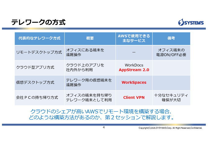 本Webセミナーでは、これらのAWSのサービスを使って、素早くテレワーク環境を構築する方法について、実際にAWSの各サービスのライブ・デモを交えて紹介いたします。