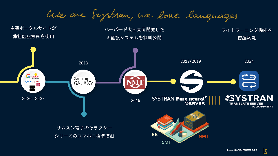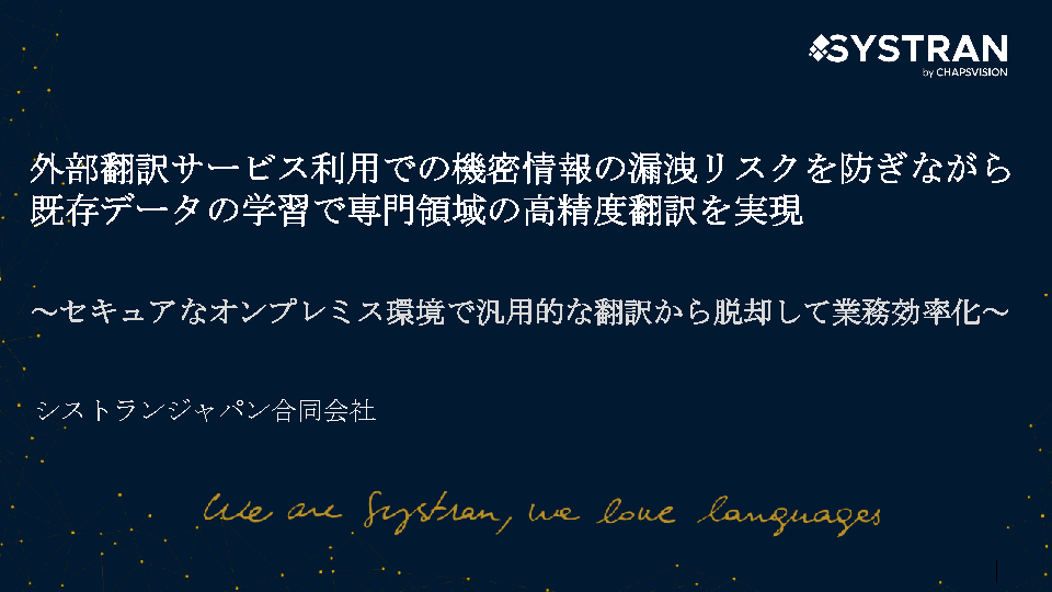 本セミナーでは自社専用のオンプレミス翻訳を構築して、データの機密性を保ちながら、企業独自の用語や文脈を学習させることで専門性の高い高精度な翻訳をセキュアに実現する方法を解説します。
