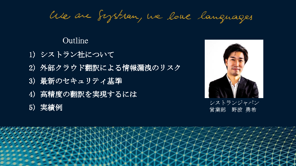 セキュリティ面、専門性の高い文章の翻訳が不十分で翻訳サービスの利用に踏み切れていないエンタープライズ企業の担当者におすすめのセミナーとなっております。