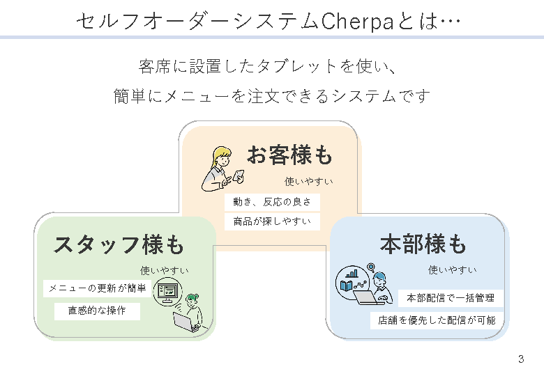 本セミナーでは、人手不足や感染症対策・インバウンド需要への対策を行える、セルフオーダーシステム「Cherpa(シェルパ)」をご紹介いたします。