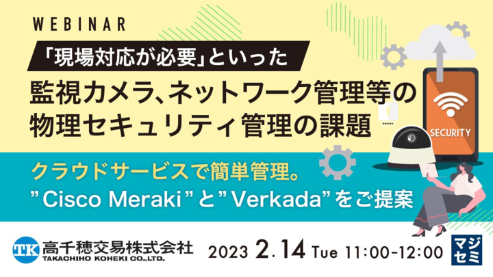 具体的な解決策としてクラウド型ネットワーク管理ソリューション”Cisco Meraki”と、クラウド型統合セキュリティソリューション”Verkada”についてご紹介致します。高千穂交易だからこそできる、両ソリューションを合わせた対策もご提案可能です。ネットワークや監視カメラなどの物理セキュリティにストレスを感じている方、管理をよりシンプルにしたい方は是非本セミナーにご参加ください。
