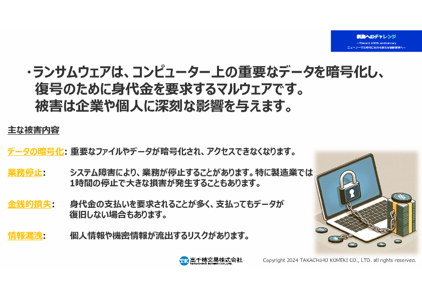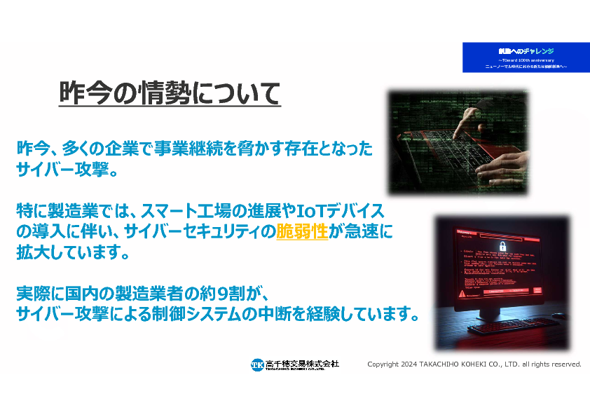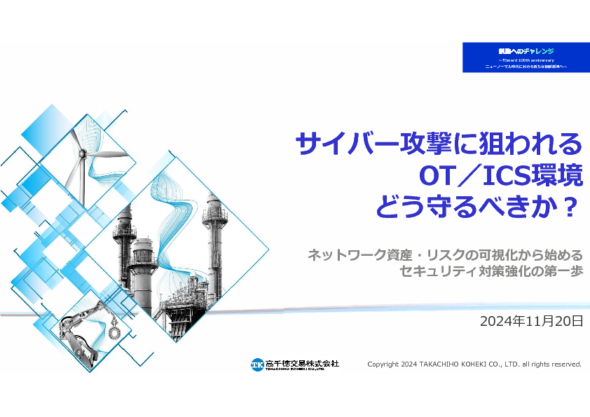 OT/ICS環境におけるサイバー攻撃の現状とセキュリティを強化する上での課題を整理するとともに、製造業を中心とした物理セキュリティシステムや情報ネットワークシステムに対するトータルソリューションを提供する高千穂交易の取り組みを紹介します。