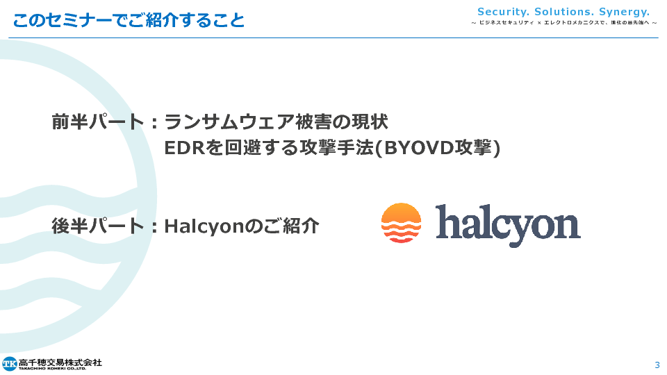 従来の対策では完全に防げないランサムウェア。万が一自組織が感染した場合、どうすればいいのでしょうか。本セミナーでは、その最適解として、ランサムウェア専用セキュリティプラットフォーム「Halcyon」をご提案します。