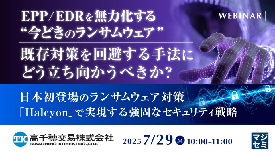 「既存のランサムウェア対策で十分なのか?」「万が一、ランサムウェアに感染してしまったらどうすればいい?」という悩みや不安を抱えている企業・組織の情報システム部門/セキュリティ運用部門の方はぜひご参加ください。