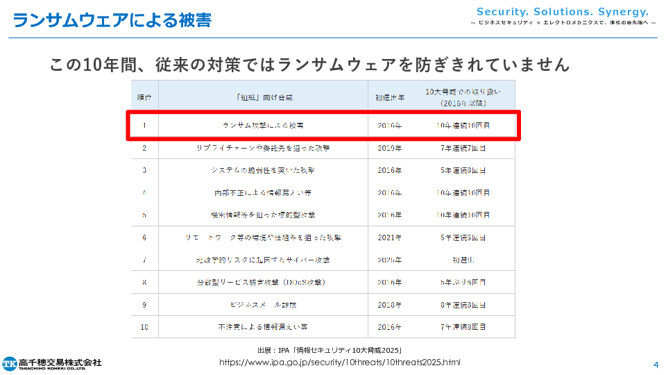 今後もその脅威は継続すると予想され、あらゆる業種・規模の企業にとってランサムウェア対策は喫緊の経営課題といえます。