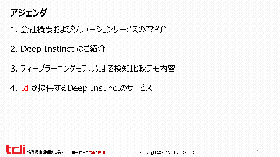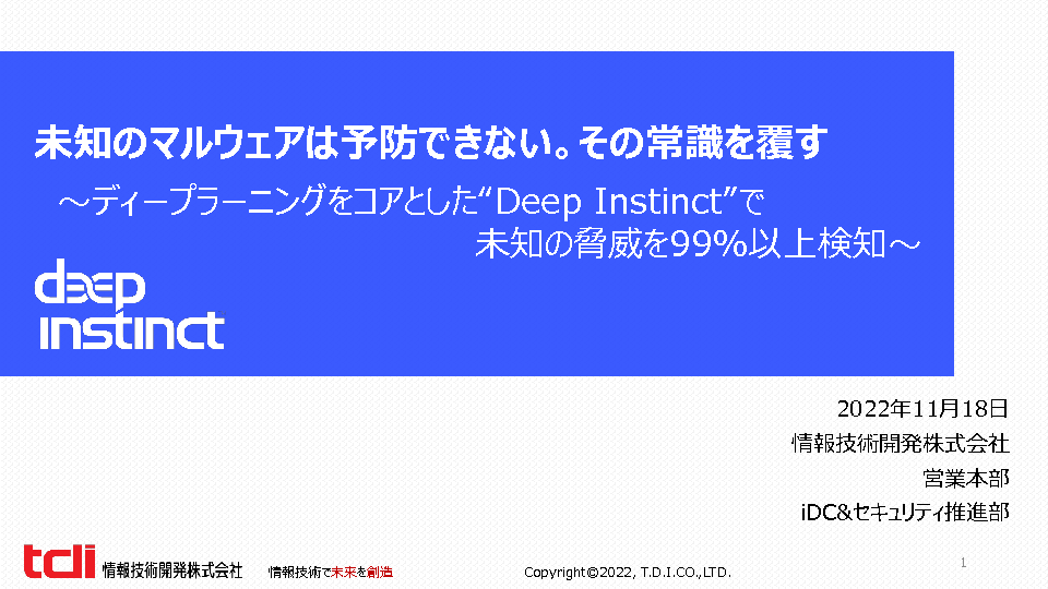 そして、“未知のマルウェアは予防できない”という常識を覆す『Deep Instinct』を検知デモを交えご紹介いたします。