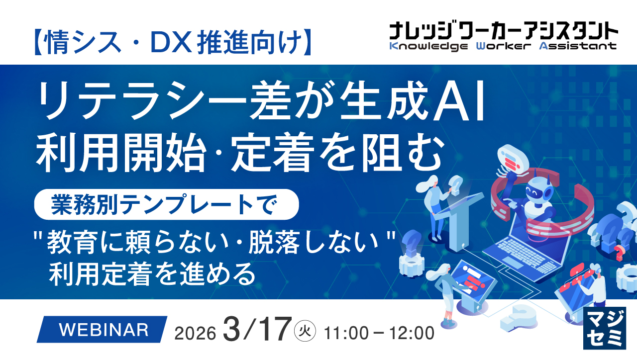 本セミナーでは、個人利用のリスクや教育コストの壁を突破し、ITリテラシーを問わず誰もが「使えるAI」を組織に定着させる解決策として、対話型AI「KWAアドバイザー」を事例とともに解説します。「KWAアドバイザー」が備えるスマートテンプレートは、プロンプトの知識が不要なため、個人のスキルに依存しない利用促進が可能です。