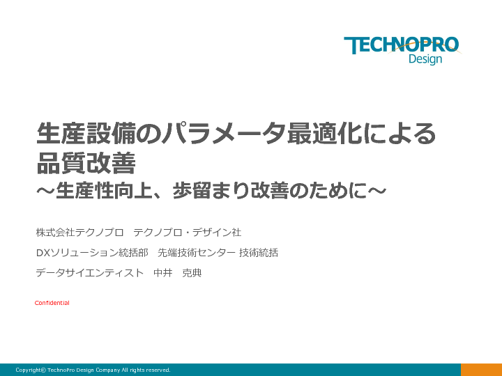 そこで本セミナーでは、上記の課題を解決するため、AI技術を用いて生産設備のパラメータを最適化する方法について、製造業におけるAI活用において豊富な経験、ノウハウ、事例を有する株式会社テクノプロが解説します。