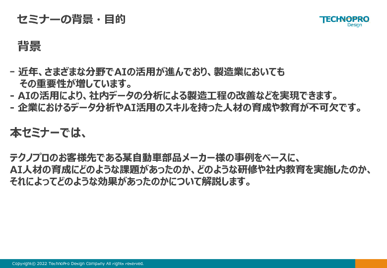そこで本セミナーでは、テクノプロのお客様先である某自動車部品メーカー様の事例をベースに、AI人材の育成にどのような課題があったのか、どのような研修や社内教育を実施したのか、それによってどのような効果があったのかについて解説します。
