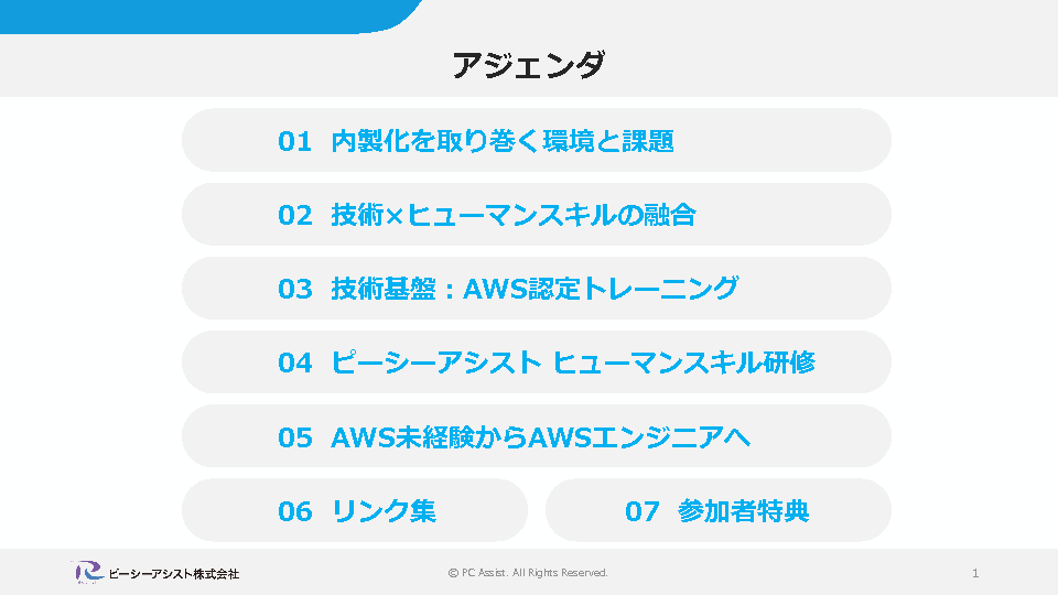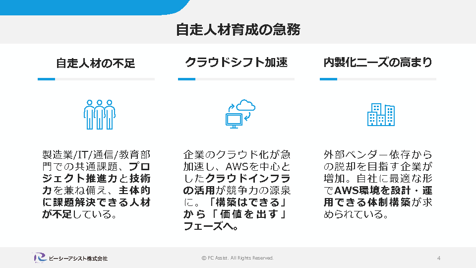 ピーシーアシスト社が提供する研修プログラムは、AWSの設計・運用スキルの習得に加え、チーム内での課題解決力やプロジェクト推進力を養うためのカリキュラムを統合。実際にユーザー企業の声をもとに、AWS研修単体では実現しにくい“成果を出せる育成体系”を事例を交えて解説します。技術とヒューマンスキルを掛け合わせ、AWS内製化を真に実現するための人材育成の最前線を、具体的なプログラム構成と成果例を通してご紹介します。