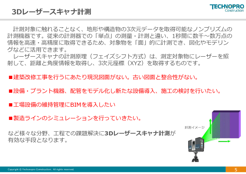 3Dシミュレーションの導入において多くの現場が直面するのが、シミュレーション以前の「準備工程」にかかる負荷です。現況把握のための測量、既存図面の整理、点群データからの3D化、さらにシミュレーションに耐えうる精度や軽量化の調整など、工程が分断されやすく、手戻りが発生しやすい状況が生まれがちです。結果として、点群データは取得したものの「重くて使えない」「ノイズ除去や切り出しに時間がかかる」といった理由で、シミュレーションに投入できない(開始時期の遅延、費用や期間がかかり過ぎ立ち上げの断念)という課題が設備保全担当者の大きな負担になっています。