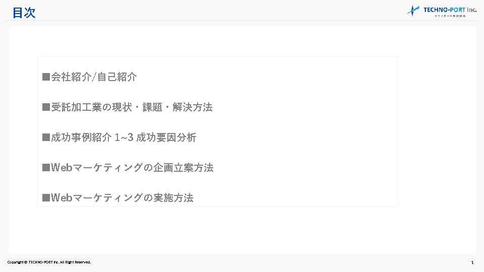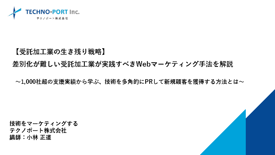 本セミナーでは、技術の差別化が難しい受託加工業を対象に、テクノポートが独自に開発した成果を上げるWebマーケティングの具体的な手法について、実際の適用事例を交えながら詳しく解説します。