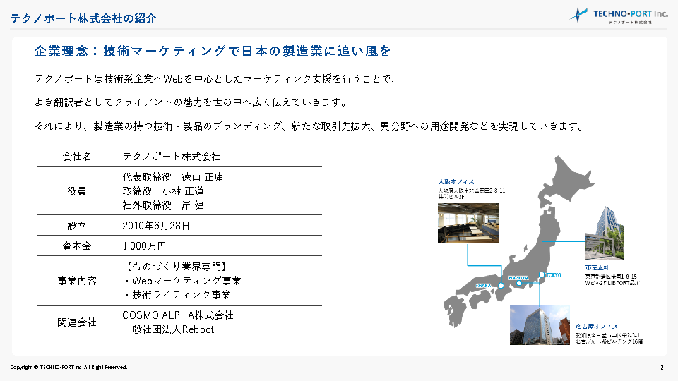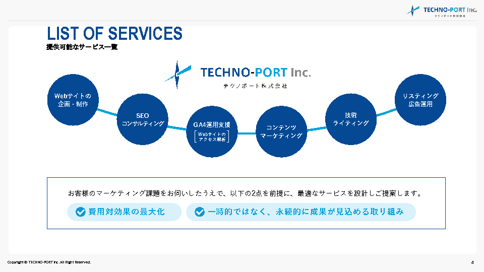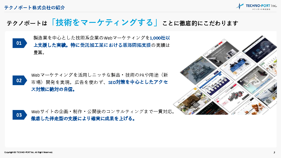 テクノポートは「技術をマーケティングする」を掲げ、特に受託加工業を中心に1,000社以上の企業を支援してきた豊富な実績があります。今回はその豊富な実績から得た知見を活かし、従来の自社技術の訴求というアプローチに加えて、「技術」「提供機能」「市場」の3つの視点で自社の資源を整理し、市場反応を踏まえたキーワードの絞り込みによる効果的なSEO手法を取り入れ、市場での製品やサービスの認知度を向上させることで、新規顧客の獲得に貢献いたします。