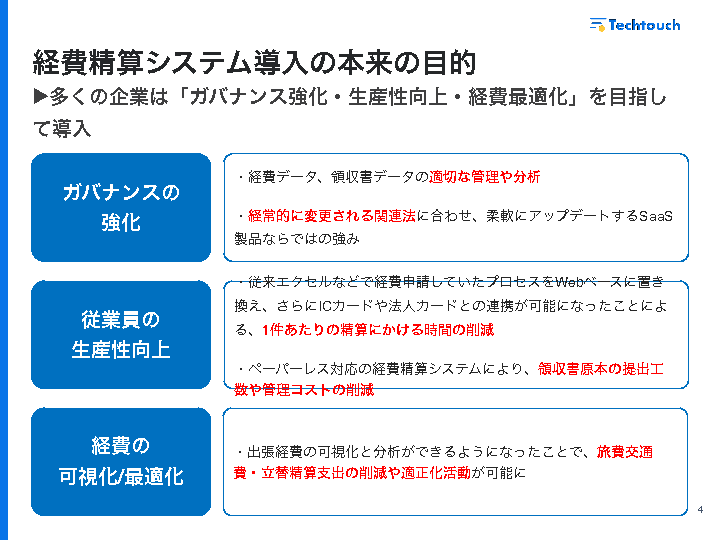 また、コスト削減だけではなく、コンプライアンスやガバナンスといった経営課題も解決することが期待されています。