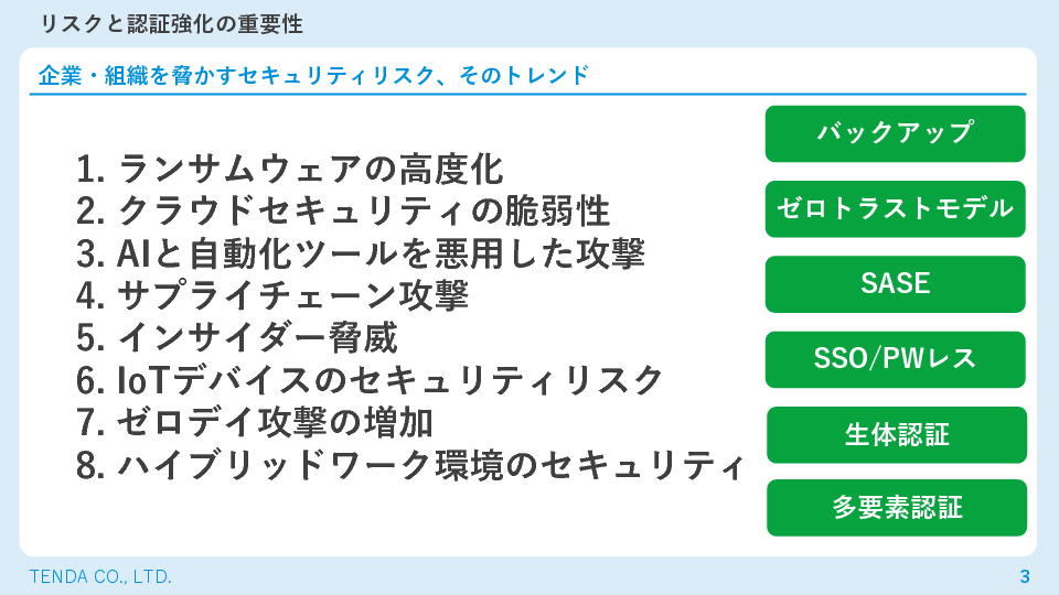 例えば、クラウドサービスにアクセスする際に用いられるパスワード認証は、利用サービス数の増加に応じて管理する認証情報(ID/パスワード)も増え、煩雑になってしまいます。さらに、昨今のサイバー攻撃被害の拡大や攻撃手法の変化などを考慮すると、従来のパスワード認証を使い続けることは自社の情報資産を危険に晒すことに繋がります。
