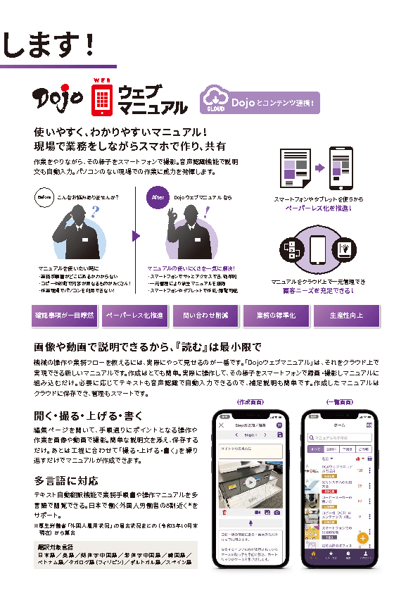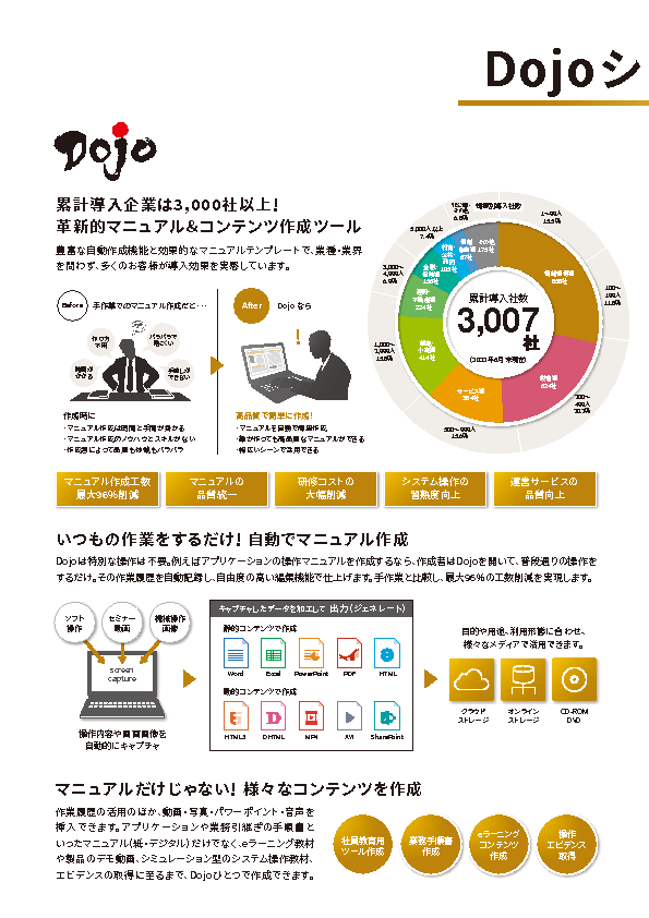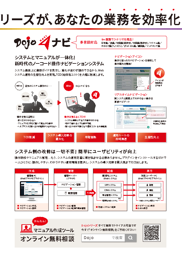 本セミナーでは、マニュアルの自動作成をはじめとして、コールセンターの運営全般の効率化を支援するテンダ社のDojoシリーズを紹介します。
