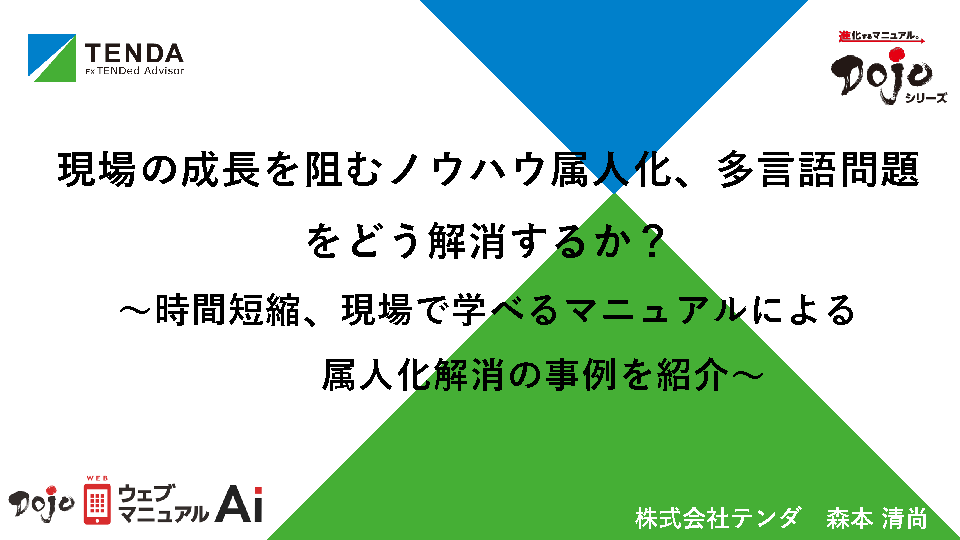 14:05~14:45 現場の成長を阻む、ノウハウ属人化、多言語問題をどう解消するか 〜時間短縮、現場で学べるマニュアルによる属人化解消の事例を紹介〜