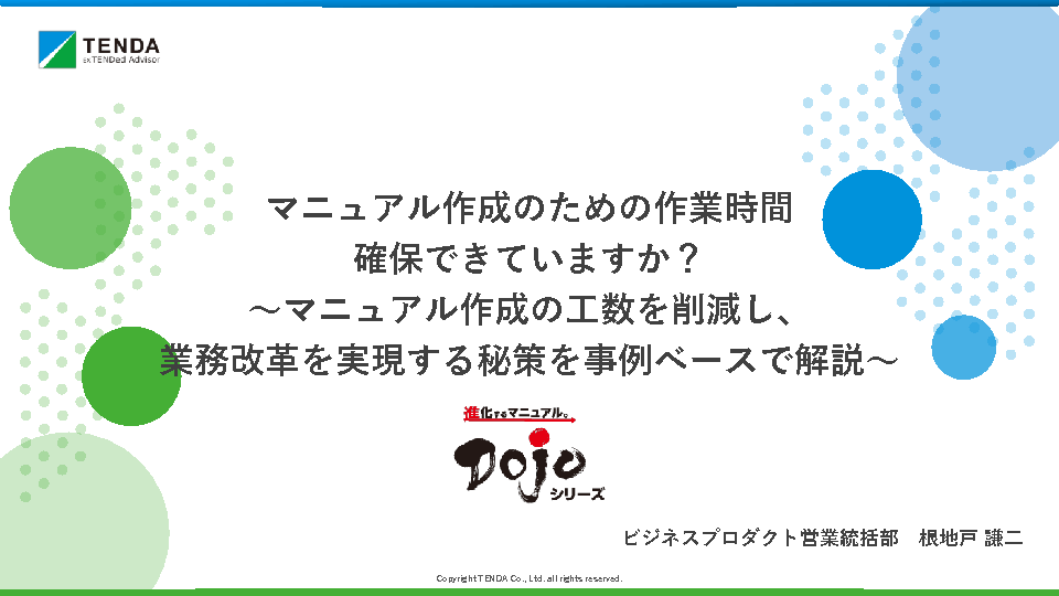 今回のセミナーでは、作成工数を最大96%削減し、導入累計3000社以上の実績をもつ自動マニュアル作成ツール「Dojo」について、マニュアル整備を起点とした業務改革の事例を解説します。
