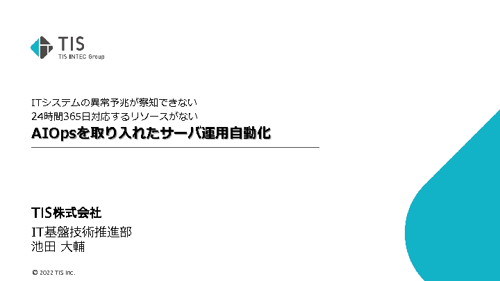 11:05~11:45 ITシステムの異常予兆が察知できない、24時間365日対応するリソースがない〜AIOpsを取り入れたサーバー運用自動化〜