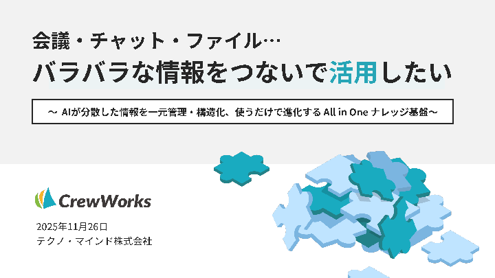 本セミナーでは、会議・チャット・タスク・ファイルをひとつに集約し、日常の業務をナレッジとして蓄積できる All in Oneナレッジ基盤「CrewWorks」 を紹介します。当日は実際の画面イメージを通して、議事録から最終資料までがどのようにつながるか、AIが会話・資料・タスクをどのように関連づけて “知識を構造化” していくかを体感していただけます。CrewWorksのAIは、 自社の会議・チャット・ファイル情報を一元管理・整理し、必要な情報を即座に呼び出す仕組みを提供。 複数ツールのライセンスや運用負荷を削減でき、 コスト面でも効率化 を実現します。初めての方でも手軽に試せる フリープラン(無料) を用意しており、導入前に操作感を体験可能です。