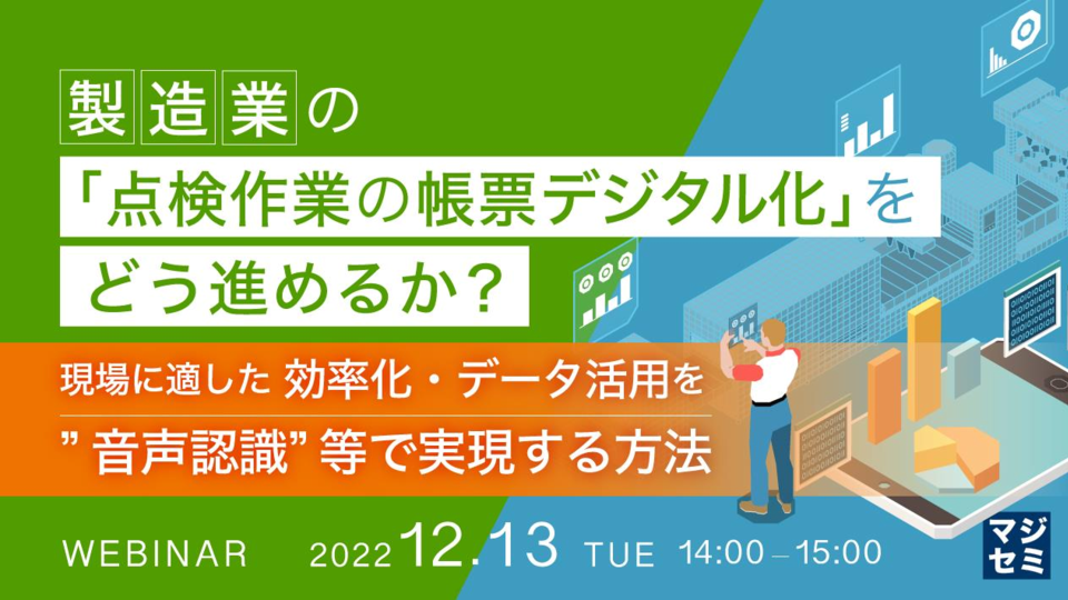 本セミナーでは、製造業における点検作業の帳票デジタル化の実現ステップ、課題解決方法について解説致します。また、課題の具体的な解決策として”音声認識”等を具備するソリューションで解決する方法をご紹介致します。点検作業の帳票デジタル化をどのように進めてよいかわからない、どのように課題を解決すればよいかわからないといったお悩みをお持ちの方は是非本セミナーへご参加ください。
