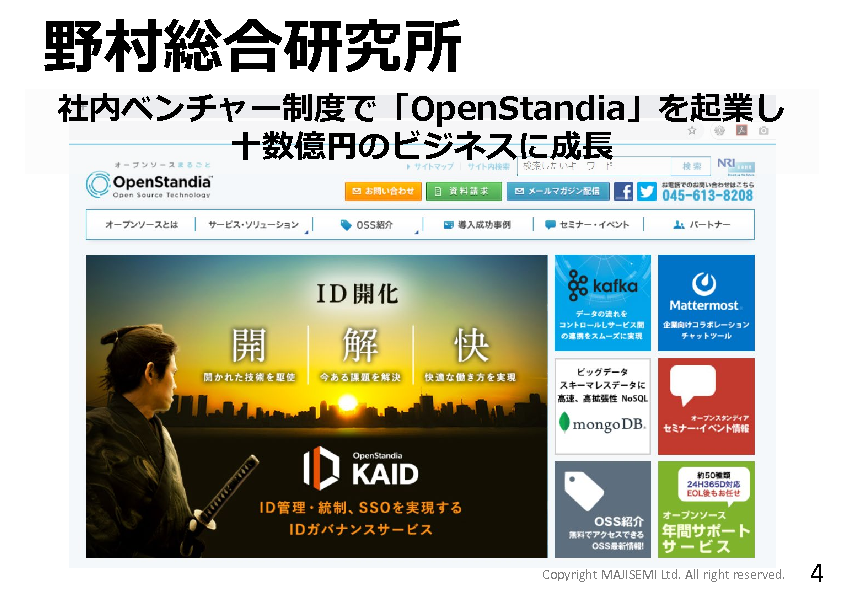 野村総合研究所(NRI)出身。NRIでは社内ベンチャーとして、当時国内トップシェアであるオープンソース・サポートサービス「OpenStandia」を起業。
