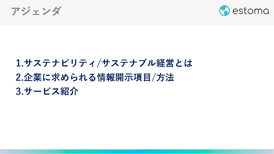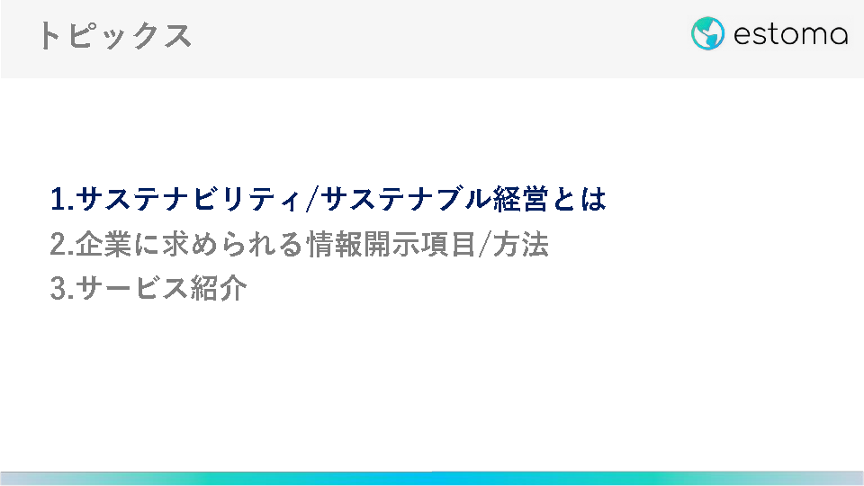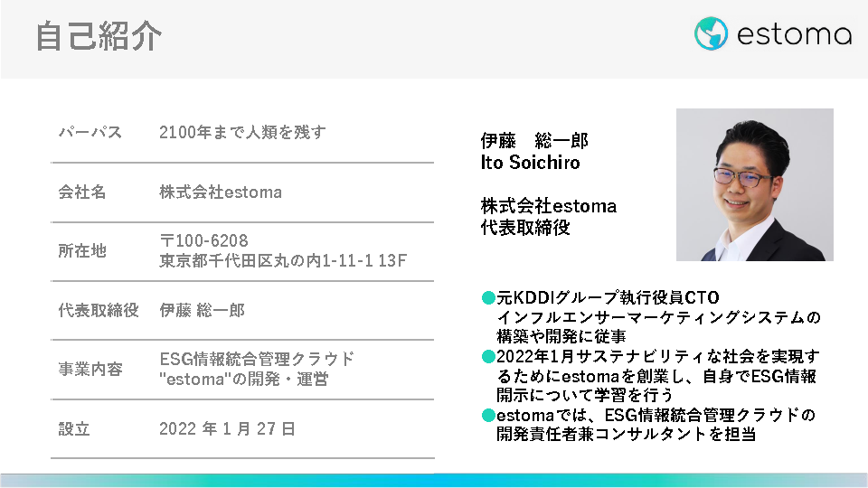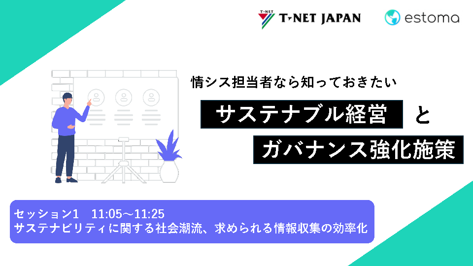 11:05~11:25 セッション1:サステナビリティに関する社会潮流、求められる情報収集の効率化(株式会社estoma)