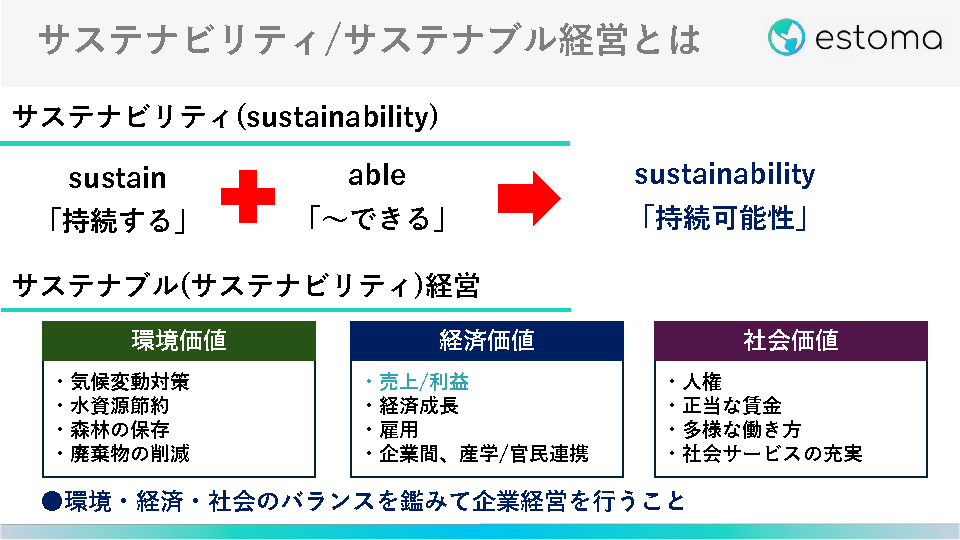 また、多くの企業が社会的責任(CSR)や持続可能な社会の実現への貢献、自身の競争力を強化するために「サステナブル経営」の実現を目指しています。
