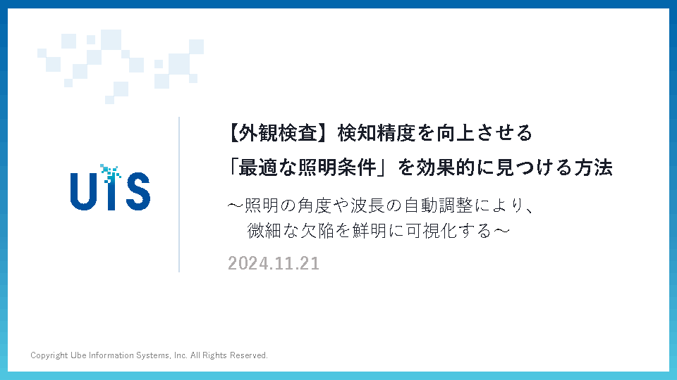本セミナーでは、宇部情報システムが開発した革新的な自動照明調整装置『OPTLAC 1.0(仮称)』を用いた、微細なキズや欠陥の最適な照明条件の自動選定方法について、その仕組みや効果を詳しく解説します。