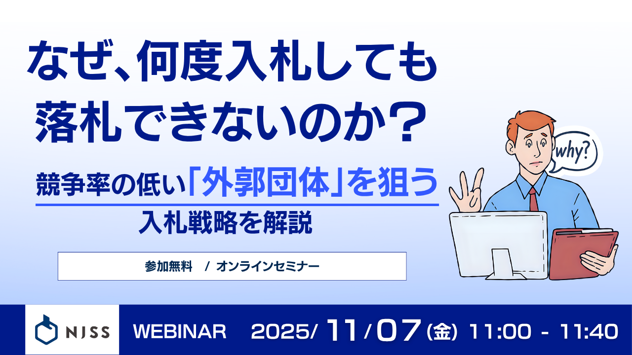 本セミナーでは、入札情報速報サービス「NJSS」を活用した外郭団体攻略法を解説します。外郭団体とは、日本郵政グループ、JRA、URなど国や自治体と連携する約2,000の公的機関です。多くの企業がその存在を知らないため、競争率は大幅に低くなっています。NJSSは全国の発注機関から年間180万件以上の案件を収集し、外郭団体の情報も網羅しています。セミナーでは、どうすれば競争率の低い案件を見つけられるのかを実際の画面でお見せします。競合を避けて確実に実績を積み上げたい方は、ぜひご参加ください。