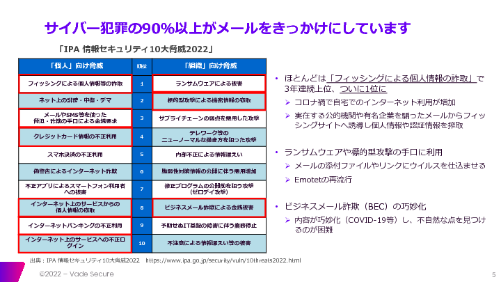 昨今ではシステムを暗号化し身代金を要求するランサムウェア、検知が難しく多くの情報を窃取するEmotetなどによる被害が急増しています。