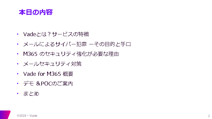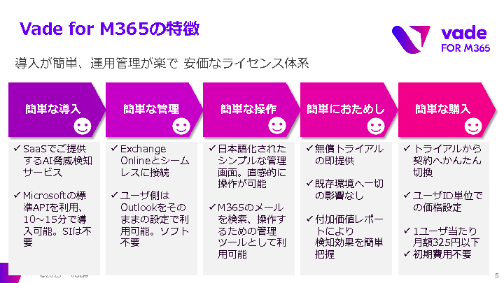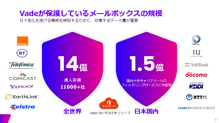 具体的な手段として、AIを活用したメールセキュリティ対策「Vade for M365」をご紹介します。Vade for M365は、毎日14億アカウントものメールセキュリティへの脅威を学習し、未知の脅威にも対応可能なソリューションです。