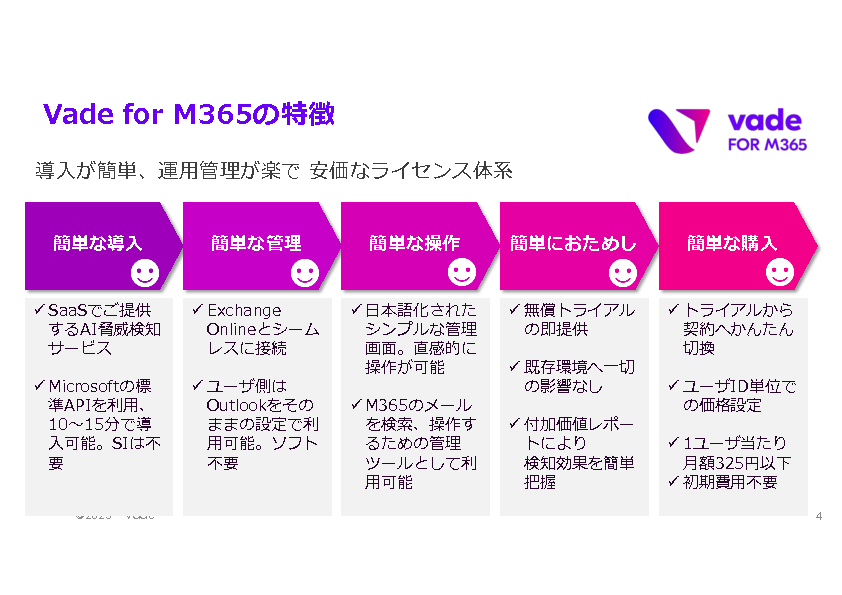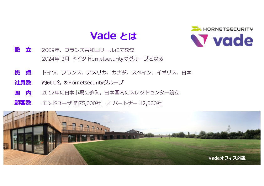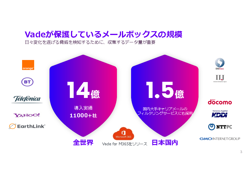具体的な手段として、AIを活用したメールセキュリティ対策「Vade for M365」をご紹介します。Vade for M365は、毎日14億アカウントものメールセキュリティへの脅威を学習し、未知の脅威にも対応可能なソリューションです。