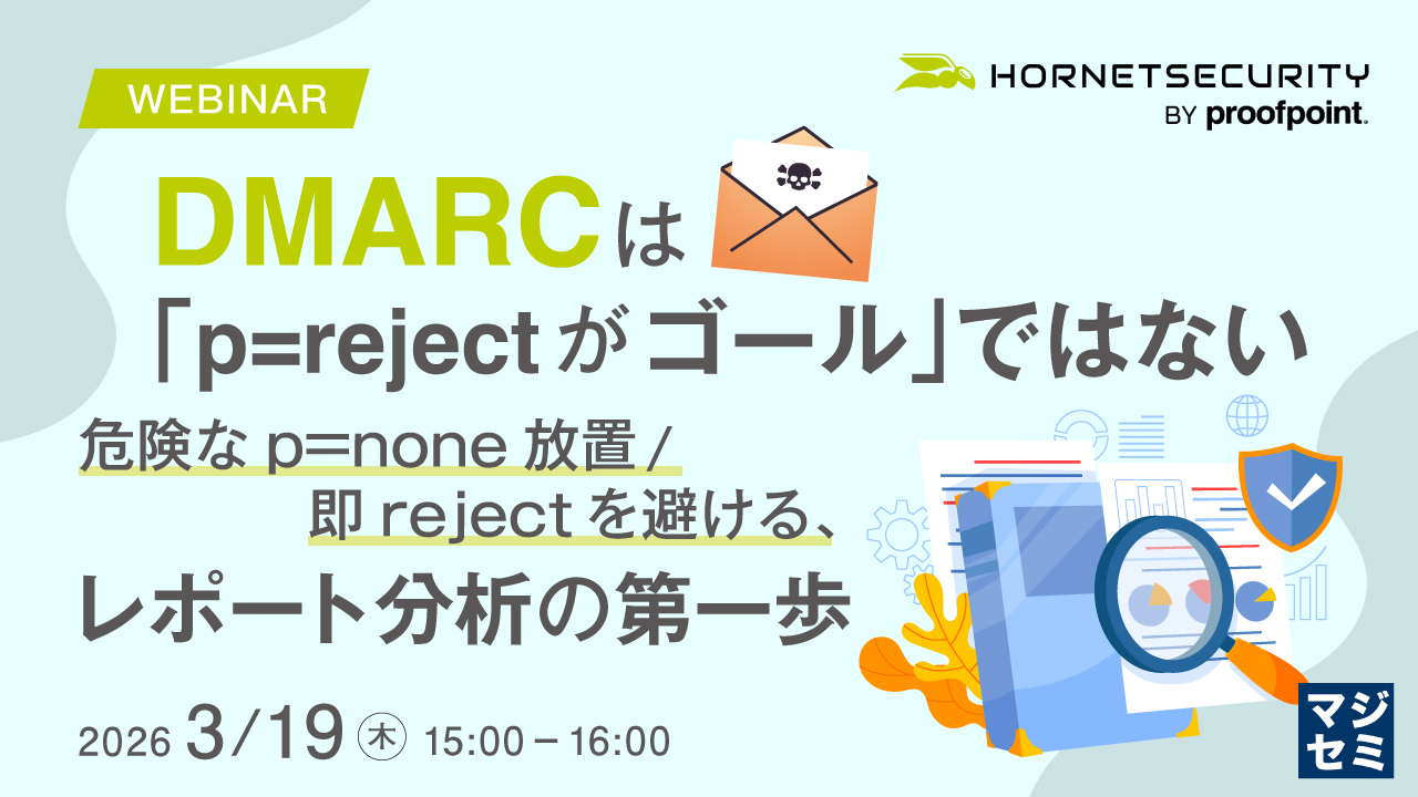 本セミナーでは、「p=rejectが唯一の正解」という単純化を避け、DMARCレポートを根拠に“自社にとって”どこまで強化できるかを判断する考え方を整理します。誰が自社ドメインで送っているのか(正規・未承認・設定ミスの可能性)、認証結果がどう分布しているのか、どの送信が業務影響に直結しやすいのかといった観点でレポートを分析し、段階的に方針を決める手順を解説します。転送や外部配信が関わる環境では、p=rejectへ上げる判断だけでなく、あえて据え置く判断が合理的なケースもあります。重要なのは、「適当にp=none」ではなく、根拠を持って「変える/維持する」を選べる状態にすることです。DMARCレポートは膨大かつ複雑であり、継続的に読み解き判断材料として活用するのは容易ではありません。本セミナーでは、DMARCを“導入の話”から“運用と判断の話”へ引き上げ、正規メール不達の事故を避けながら、なりすまし対策としての効果を着実に高めるための視点・材料・進め方を、実務目線で整理します。すでにDMARCを導入済みの企業様にもおすすめの内容です。