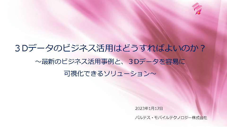 そこで本セミナーでは、扱いが難しい3Dデータを容易に可視化できる方法と、最新のビジネス活用事例を解説します。