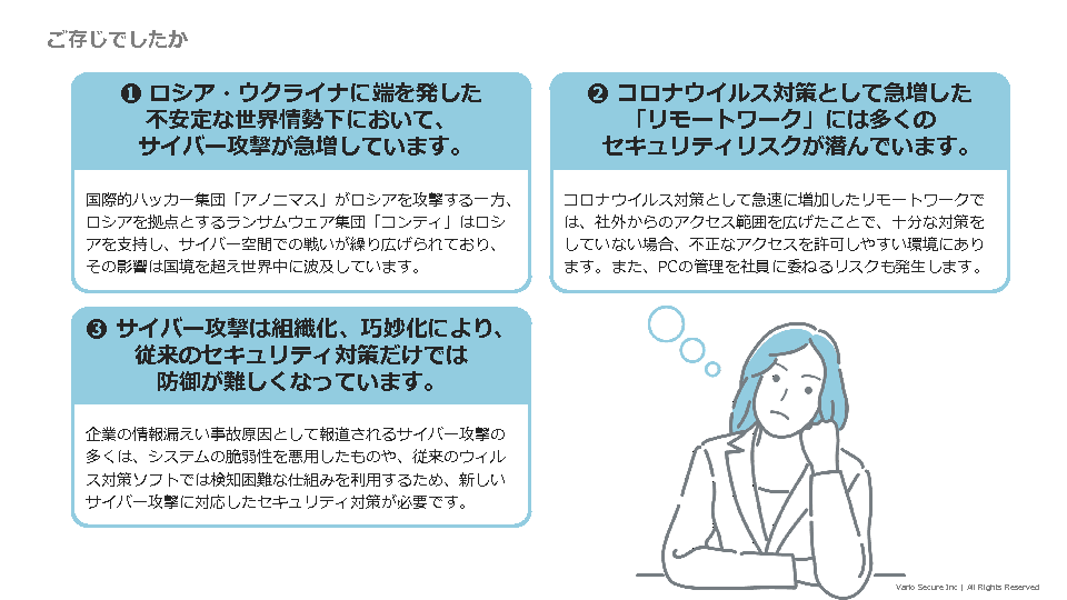 近年、不安定な世界情勢が続く中、その混乱に乗じたサイバー攻撃が急増しています。組織化、巧妙化した現在のサイバー攻撃では、従来のセキュリティ対策だけでは防御が難しくなってきました。
