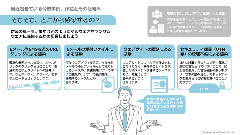 特にセキュリティ対策に手が回らない中小企業や医療機関・公共施設などを狙う攻撃の被害が後を絶ちません。