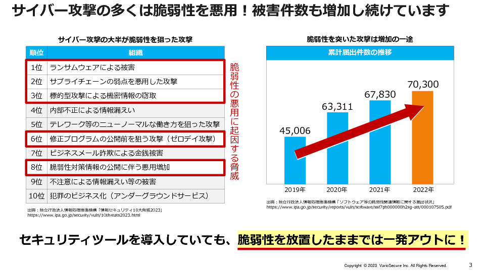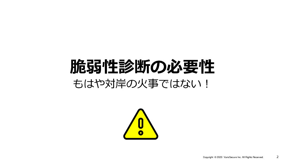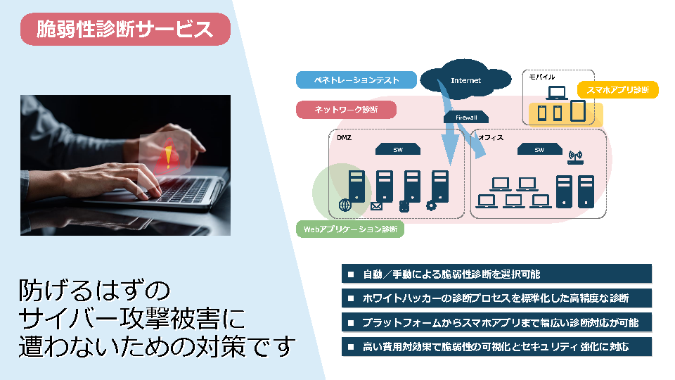 サイバー攻撃の手法が日々進化し新たな脆弱性が絶えず発見されている状況において、情報セキュリティ脅威から自社を守るためには、FWやUTM、IPS、WAF等のセキュリティツールだけに頼るのではなく、定期的に脆弱性診断を取り入れ脆弱性を把握・管理・対処することが重要となります。