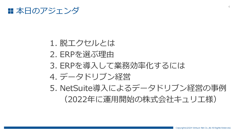 13:05~13:20 Excel依存から脱却 ERP導入でデータドリブン経営を実現するために重要なポイント ~業務効率化と一元管理されたデータの活用方法を具体的に解説~(株式会社ベンチャーネット)