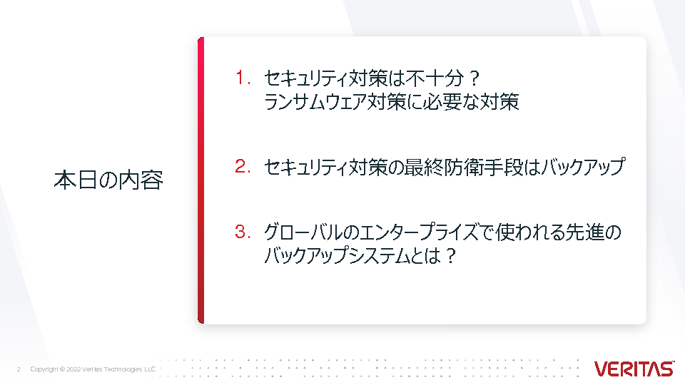 本セミナーでは、セキュリティ一辺倒のランサムウェア対策だけではなく、感染被害を最小限に抑えるために欠かせないデータ保護・管理対策の重要性を解説します。