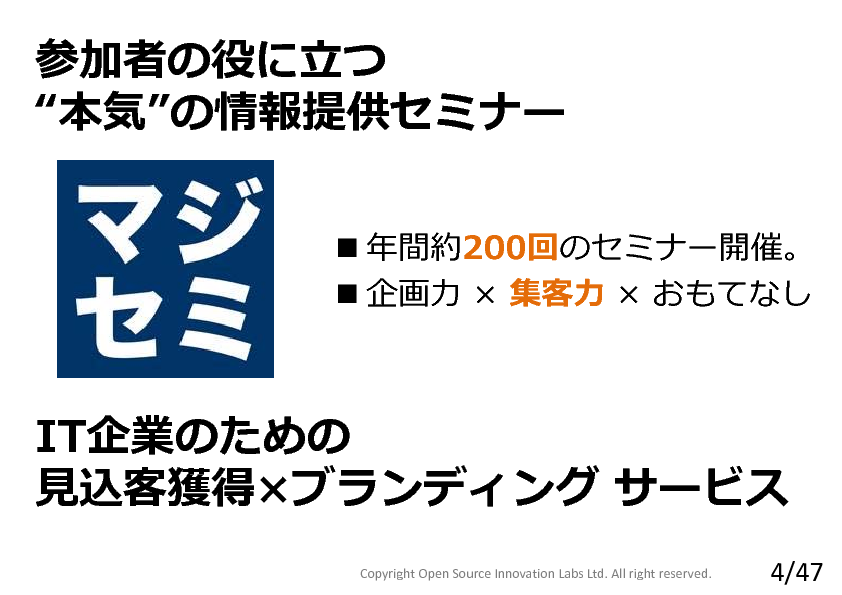 当社は、本フォームから取得する個人情報をオープンソース活用研究所、及び、本セミナーの主催・共催・協賛・協力・講演の各企業へ提供します。