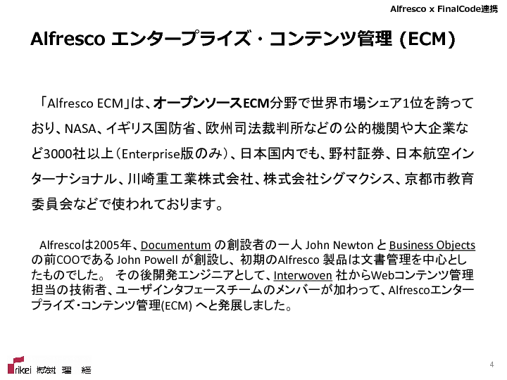 14:50~15:30 Alfrescoの解説と活用事例の紹介(ADFなど最新機能、API活用事例ほか)