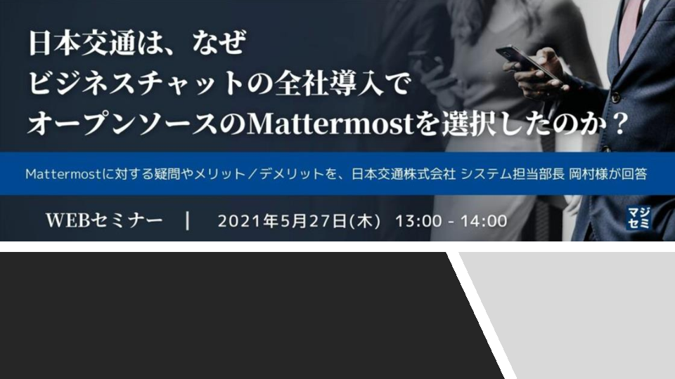 本セミナーでは、実際にMattermostの導入をご担当された、日本交通株式会社 システム担当部長 岡村様にご登壇頂き、以下のようなMattermostに対する疑問や、メリット/デメリットを率直にお答えいただきます。
