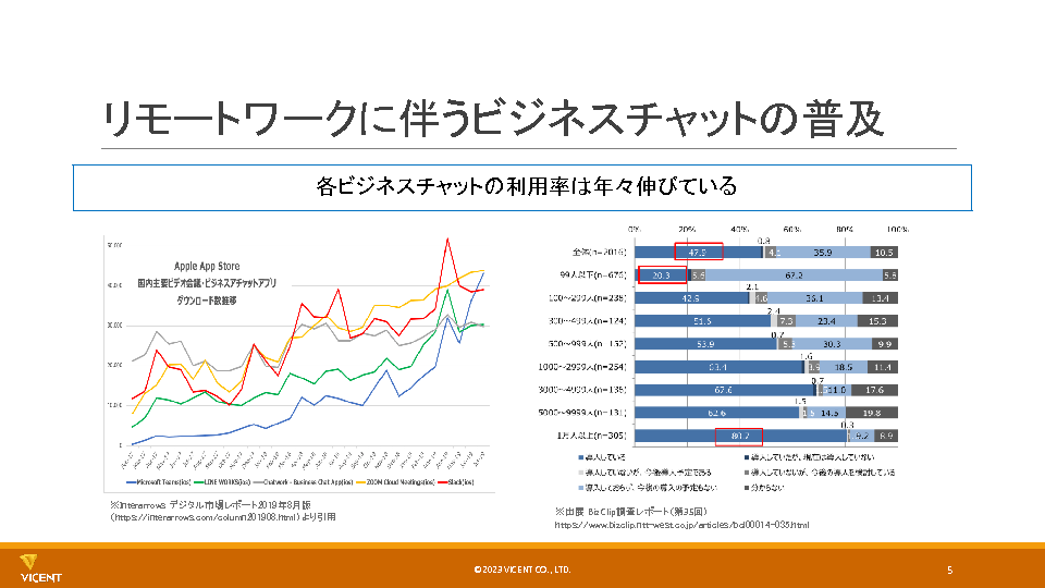 テレワーク環境における、日常のコミュニケーション手段として、SlackやMicrosoft Teamsなどのビジネスチャットは広く普及しました。