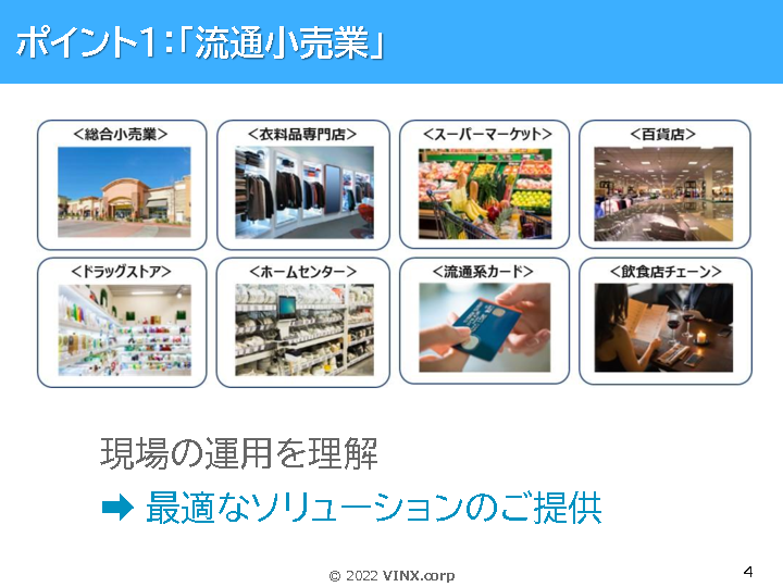 ヴィンクスは大手ドラッグストアや生活雑貨チェーンなどの小売大手もご支援させていただいている流通・小売DXのスペシャリスト企業です。