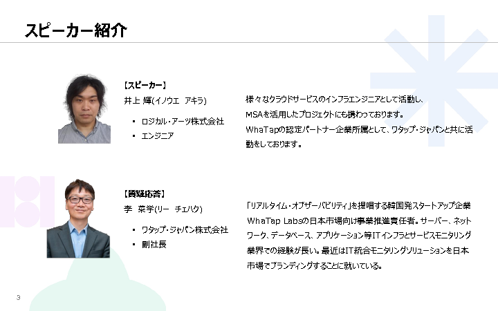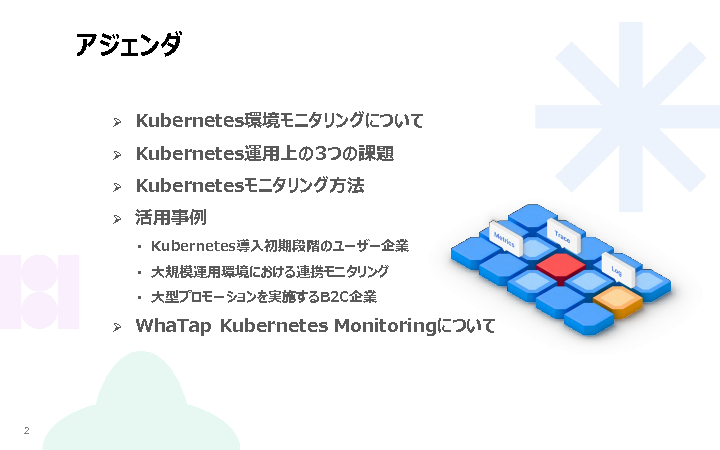 本セミナーでは、Kubernetes監視の手間と混乱を一発で解決する方法と題し、クラスタからアプリケーション、ログまでを一気通貫で可視化できるWhaTap Kubernetes Monitoringを用いた、課題解決策についてご紹介します。煩雑な監視ツール群を一本化し、障害対応の迅速化や運用工数の大幅削減を実現した事例を交えながら、リアルタイム性・多角的な可視性・容易な導入といった特長を紹介し、Kubernetes運用に悩む現場に、即効性のあるベストプラクティスを提示します。是非ともご参加ください。